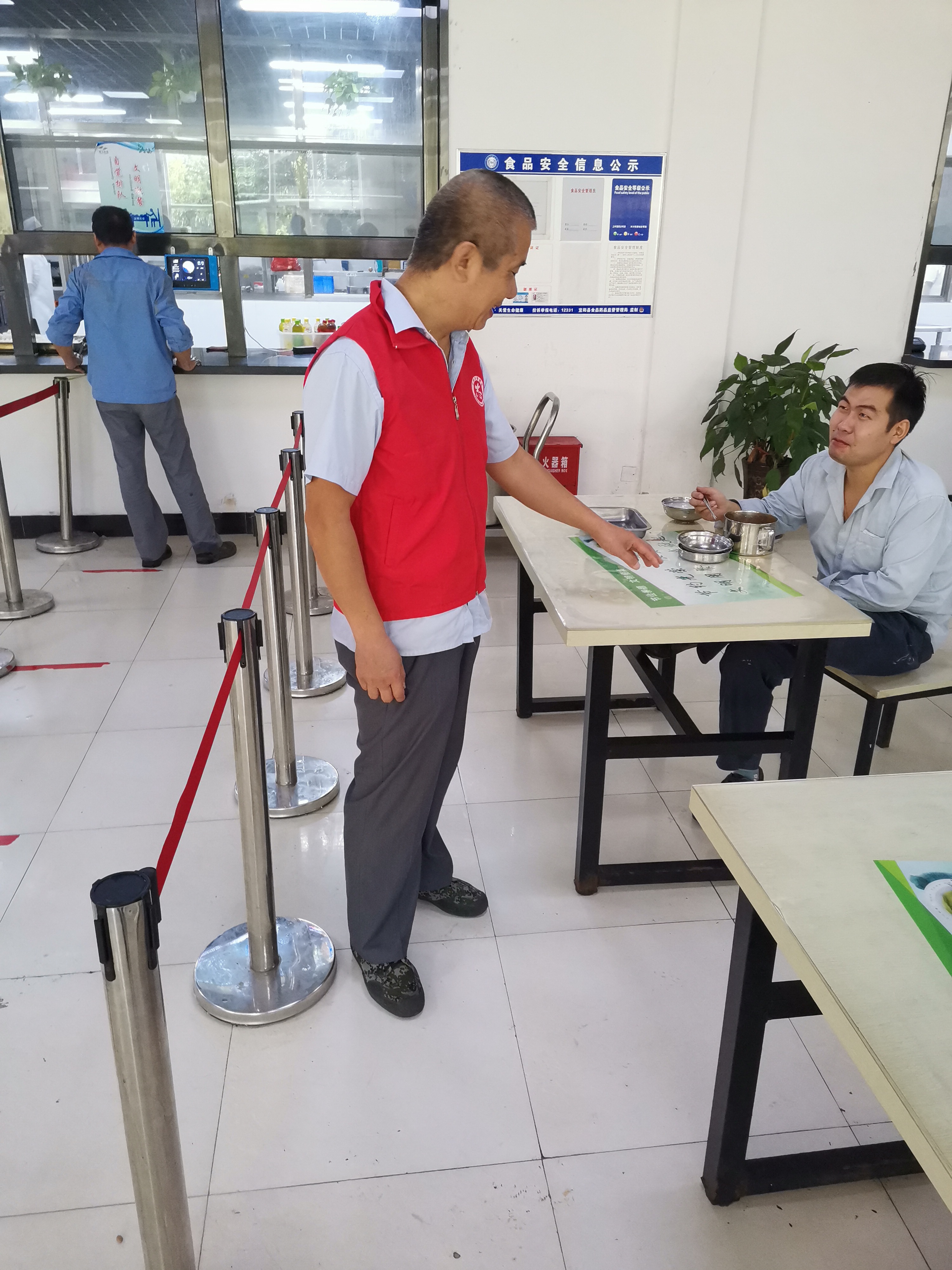 上午10:50 “文明餐桌志愿服務(wù)隊”成員已穿上紅馬甲,在職工餐廳集合,擺放好餐桌上的隔離擋板和椅子,規(guī)置好餐廳取餐窗口的警戒欄桿。11:00開飯時間到,陸續(xù)有員工到達,11:30各車間員工、外協(xié)檢修人員同時到達職工餐廳形成就餐高峰。通過“紅馬甲“的指引勸導(dǎo),職工們根據(jù)飯量不同,按需打菜,垃圾桶里剩菜剩飯明顯減少,取餐窗口排隊秩序井然,單人單桌就餐或雙人隔板就餐文明規(guī)范。